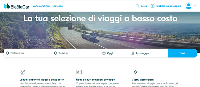 - BlaBlaCar. È l’app perfetta se preferisci viaggiare in auto ma vuoi condividere il tragitto. Ti permette di offrire o cercare passaggi, dividendo spese e impatto ambientale. Ti consente di scegliere il conducente, l’orario e il punto di partenza. Il servizio copre tragitti medio-lunghi, anche internazionali, ed è possibile anche prenotare viaggi in pullman.