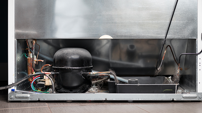 Un compressore difettoso impedisce anche la buona circolazione dell'aria e quindi il corretto raffreddamento. Il compressore si trova nella parte posteriore del frigorifero ed è riconoscibile dalla sua forma sferica. Sostituirlo da soli è più complicato a causa dei vari cavi presenti. La cosa migliore è rivolgersi a un tecnico per sostituirlo.